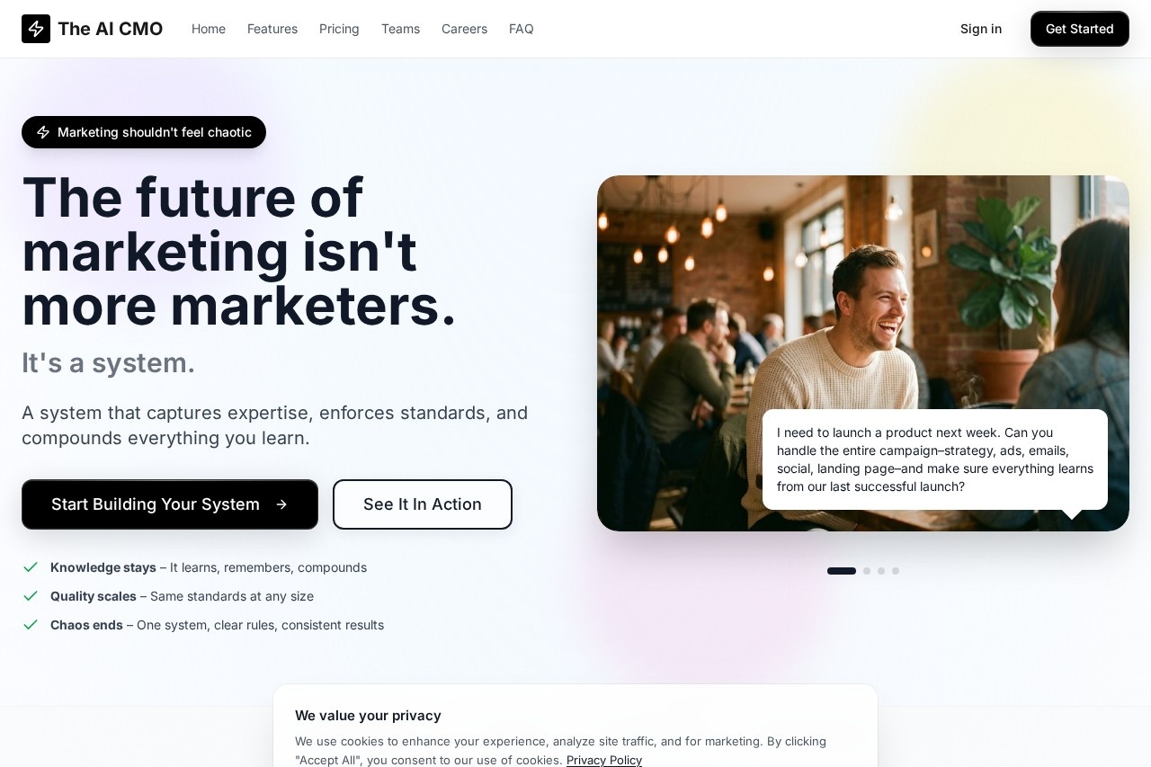 After years of watching marketing teams drown in tools, lost knowledge, and inconsistent output, TheAICMO feels like the first system built to fight entropy. It doesn't just generate content—it captures your expertise, enforces brand rails, learns from every iteration, and compounds value over time. In 2026, where attention is scarce and speed is everything, this is huge.